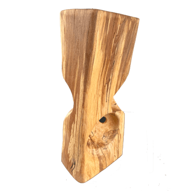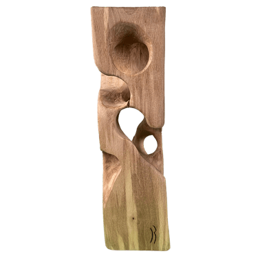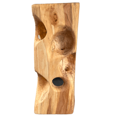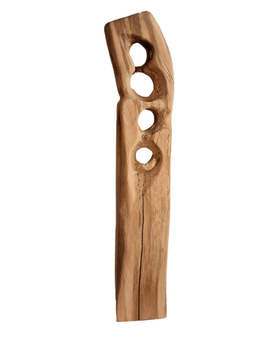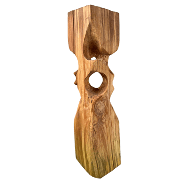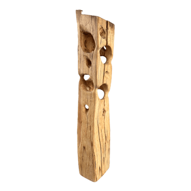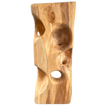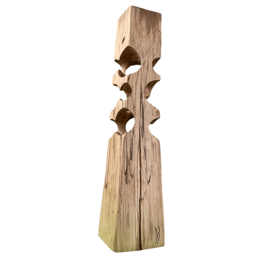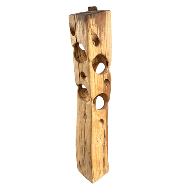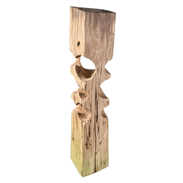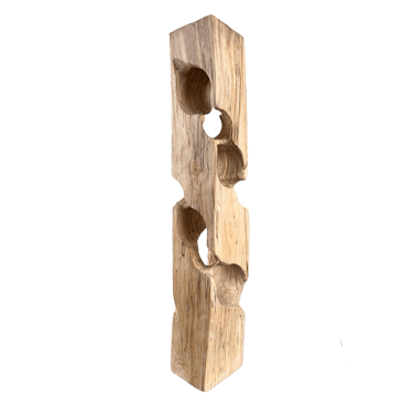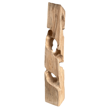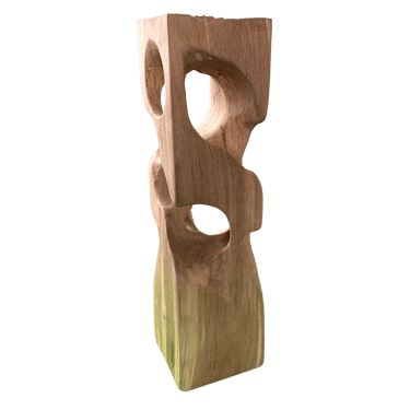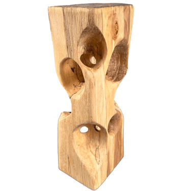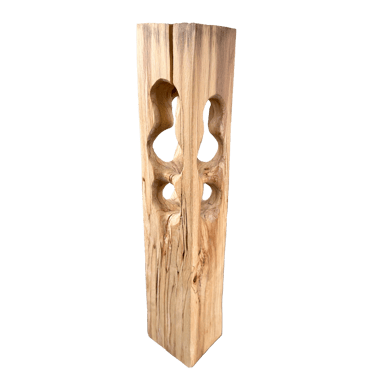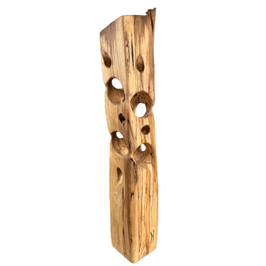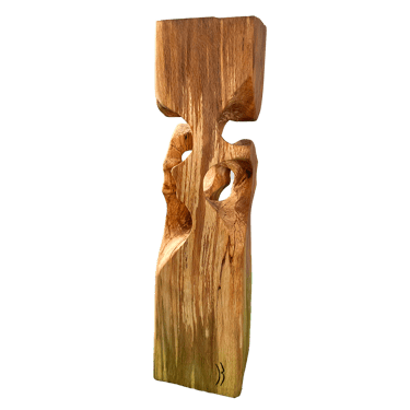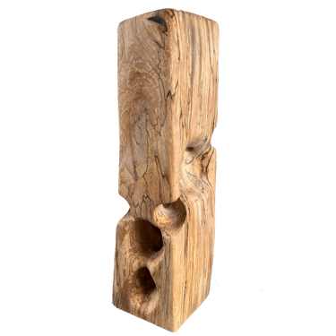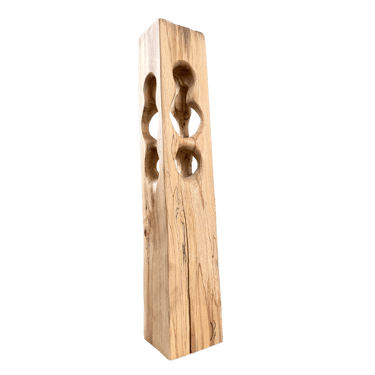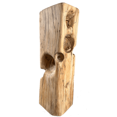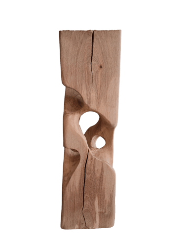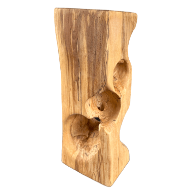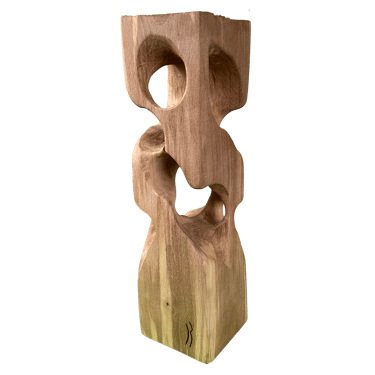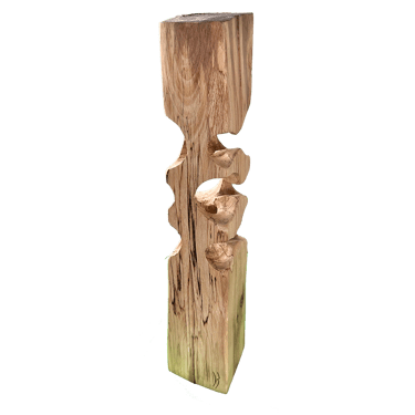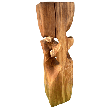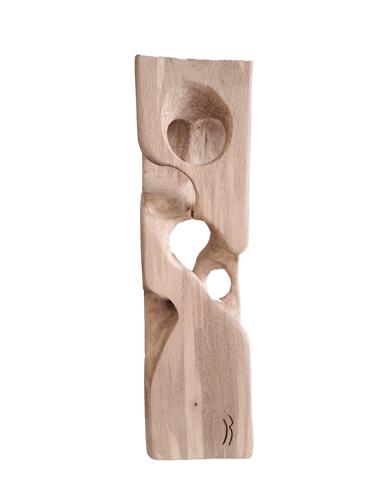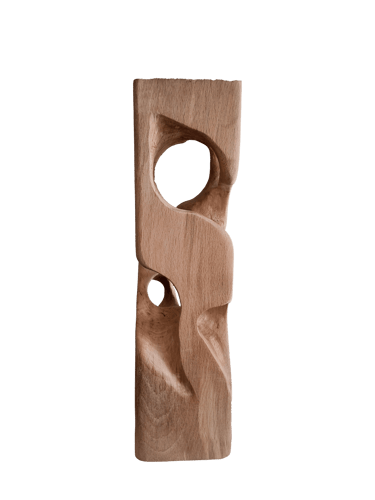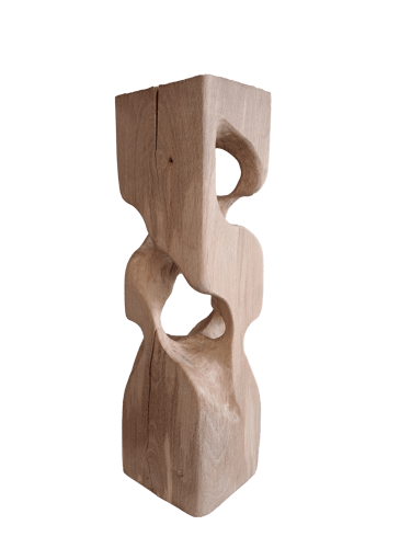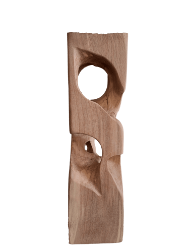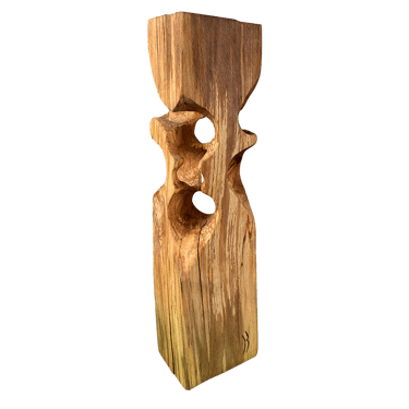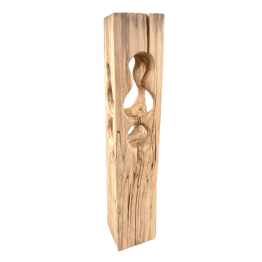C'est une torsion épurée, à la fois interne et externe. L’œil de l'observateur s'enroule autour de la sculpture puis pénètre et va jusque dans les moindres recoins pour y dénicher des détails qui le séduiront. La fente naturelle sur une des faces, dû au séchage de la réalisation, apporte une touche de sensibilité à la pièce œuvrée.