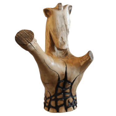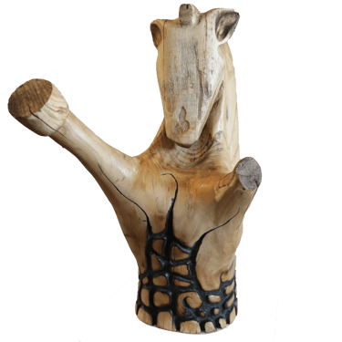 Un jour, un peu en panne d'inspiration, je me retrouve avec un morceau de bois devant moi sur la table de travail et en face de moi un cheval. Je ne suis pas trop à l'aise dans les réalisations concrètes mais à ce moment-là un lien s'est créé entre ce morceau de bois et ce cheval.