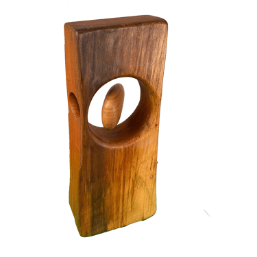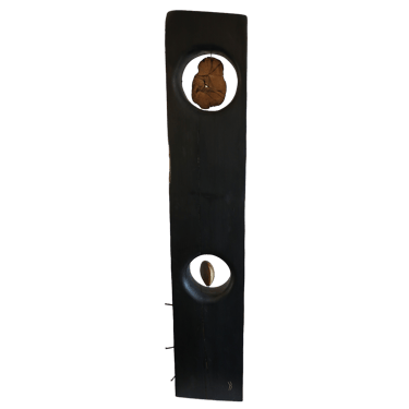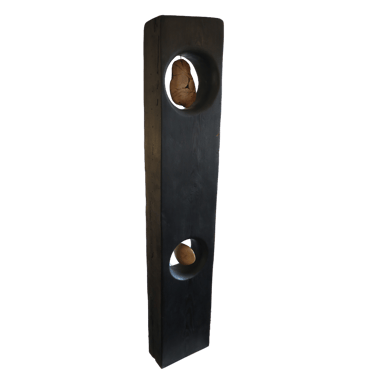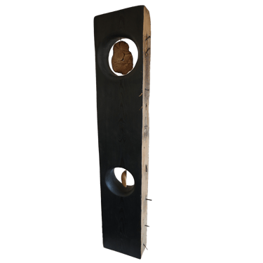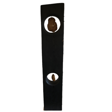 J'ai découpé une petite partie que j'ai inséré dans un autre morceau de bois précieux à mes yeux : du pin de 300 ans d'âge provenant de la maison de mes parents. Je l'ai teint en noir pour lui donner ce côté ébène et pour faire ressortir les deux morceaux de buis.